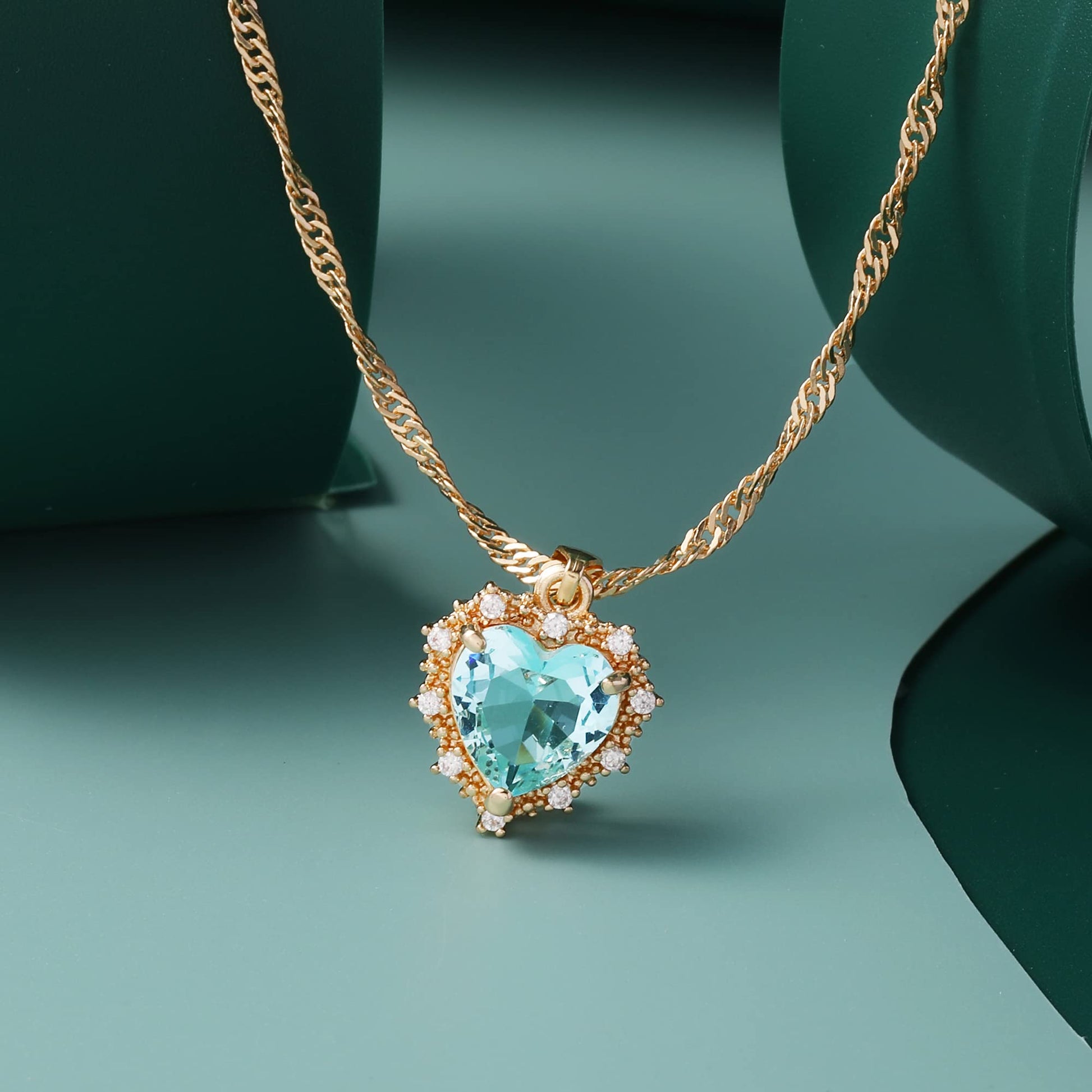 Crystal Heart Necklace for Women 14K Gold Plated with Birthstone Charm, 16"+2" (Gold Plated | Lt.Aqua)